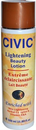 CIVIC is a moisturizing & scented lightening beauty lotion. This new formula makes it a very high quality product, very effective in lightening & fading dark spots. Specially for the treatment of acne, scars, sun blemishes, aging spots, pregnancy blemishes. For beautiful results use it with Civic Cream & Soap