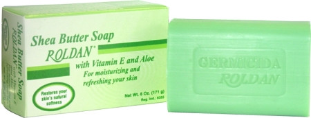 Roldan Shea Butter Soap with Vitamin E and Aloe compliments your skin by restoring its natural moisturizers. This unique formula fights rough or dry skin while cleansing and nourishing. Use daily for best results and refreshing feeling. INGREDIENTS: Shea Butter, Tocopheorl Acetate (Vitamin E), Aloe Vera, Palm Kernel Oil, Palm Oil (Soap Base 100% Vegetable), Glycerin, Titanium Dioxide, Butylated Hyderoxytolueno, Disodium Ethylenediaminetetraacetate, Pigment DC Green#5, Fragracne.