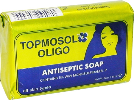 Topmosol Oligo Antiseptic Soap with Monosulfiram B.P. is effective to cleanse and protect the skin.